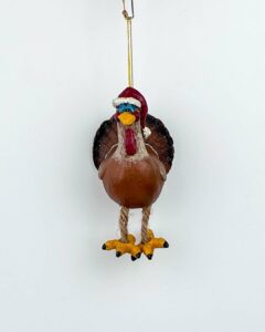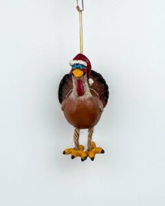This cute turkey is wearing a Santa hat in adorable fashion with roped dangling legs that add to the charm...